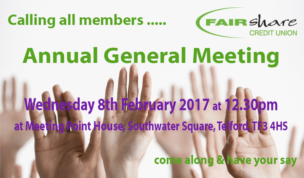 FAIRshare’s Annual General Meeting is on Wednesday, 8th February 2017, 12.30pm, at Meeting Point House, Southwater Square, Telford TF3 4HS.