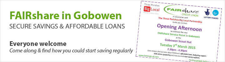 Everyone is invited to the Opening Afternoon at the Gobowen Scout Hut on Tuesday 3rd March 2015, 2.30pm – 4.30pm to celebrate this exciting new service for Gobowen. Please drop in to find out more about FAIRshare’s affordable loans, budgeting support, debt advice signposting & how you could start saving regularly. Light refreshments will be available.