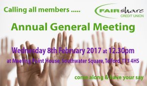 Posted on Jan 10, 2017Calling all members … your Credit Union needs you! FAIRshare’s Annual General Meeting is on Wednesday, 8th February 2017, 12.30pm, at Meeting Point House, Southwater Square, Telford TF3 4HS. FAIRshare is YOUR Credit Union, owned by and run for the benefit of its members, so please come along and have your say.