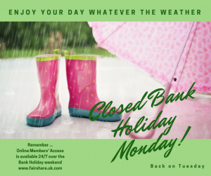 Posted on Aug 23, 2017Our Telford branch, Shrewsbury office and Member Services Telephone Line will be closed on August Bank Holiday Monday. Remember, if you’re registered for Online Members’ Access, you can manage your FAIRshare account 24/7 including over the Bank Holiday weekend. Log In to view balances and statements, requests transfers and withdrawals and for secure messaging. If you […]